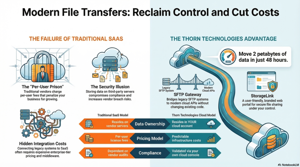 There’s a term for what this creates: a data sovereignty problem. Sovereignty means who actually possesses and controls the digital asset. Outsourcing the software interface shouldn’t mean outsourcing that control. But that’s exactly what happens when you rely on third-party file transfer vendors for your most sensitive data movement.